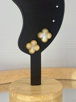 Eleganti orecchini a forma di quadrifoglio, ispirati al design iconico. - Realizzati in acciaio inossidabile. - Inserti in madreperla con riflessi cangianti. - Dettagli perimetrali dorati con piccole sfere.