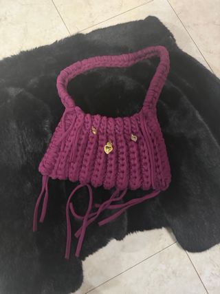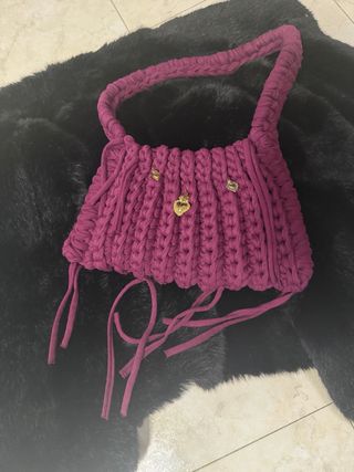 Borsa fatta a mano in filato di cotone color fucsia, con manici intrecciati e dettagli dorati. - Ciondolo a forma di cuore dorato. - Charm dorati applicati sul davanti. - Laccetti decorativi sul fondo.