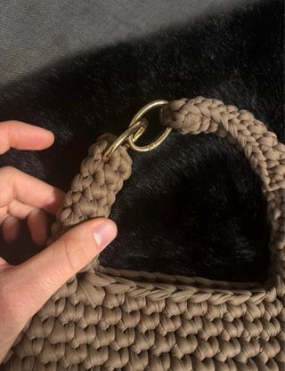 Borsa fatta a mano all'uncinetto, perfetta per aggiungere un tocco di stile. - Colore beige neutro. - Manico con dettagli dorati. - Realizzata con tecnica uncinetto.