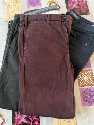 Lotto di tre pantaloni da uomo in cotone. - Pantaloni grigi - Pantaloni blu - Pantaloni bordeaux