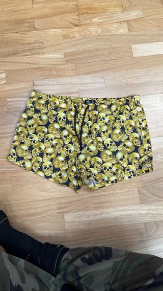 Vendo costume da bagno Zara Man da uomo, modello a pantaloncino corto con elastico in vita e laccetto regolabile, fantasia all over con teschi gialli su sfondo nero, taglia L come da etichetta. Il costume è usato ma in buone condizioni generali, con retina interna integra e tessuto ancora brillante, senza strappi né difetti rilevanti. Prezzo 18€ trattabili. Per altre foto, misure precise della vita o dettagli aggiuntivi scrivimi pure in chat.