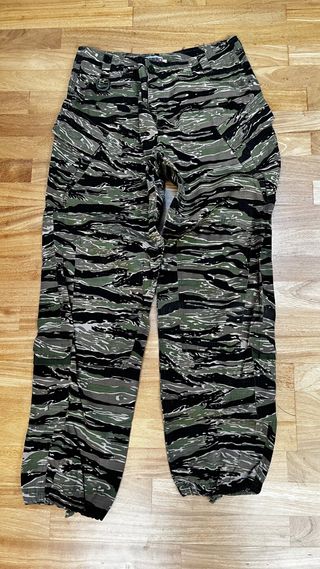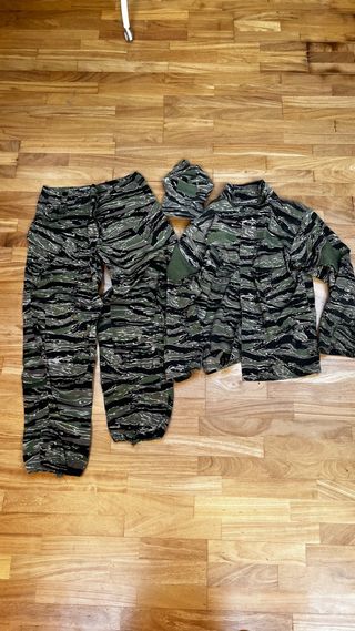 Vendo completo mimetico Swiss Arms originale in pattern tiger stripe, composto da giacca, pantaloni cargo e cappellino coordinato. Tessuto robusto in ripstop; pantaloni con numerose tasche e fondo regolabile, giacca con tasche sul petto, cappellino con inserti in velcro per patch. Il completo è in buone condizioni generali, senza strappi né macchie. Prezzo trattabile; per altre foto, taglia precisa o misure scrivimi pure in chat.