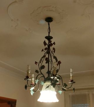 Elegante lampadario con un design floreale che aggiunge un tocco di charme a qualsiasi ambiente. La struttura in metallo è impreziosita da dettagli floreali e foglie. - Struttura in metallo con finiture verdi e rosse. - Dettagli floreali e fogliame. - Elementi in vetro trasparente.