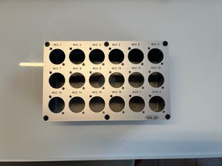 Wallplate brandizzata Funky Junk. Realizzata in metallo con 16 fori per microfoni e 2 fori ausiliari. Acquistata a luglio 2025, installata ma mai utilizzata per cambio studio.