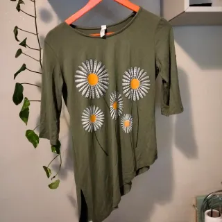 Blusa con un diseño alegre y original. - Estampado de flores blancas y amarillas. - Corte asimétrico en el bajo. - Manga tres cuartos. Made in Italy Composition 95% viscosa, 5% elastam
