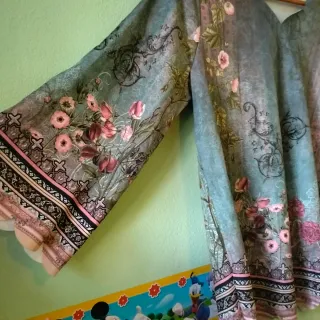 Blusa con una delicata fantasia floreale. - Maniche ampie. - Bordatura decorativa sul fondo. Composizione: polyester 95% Elastane 5%