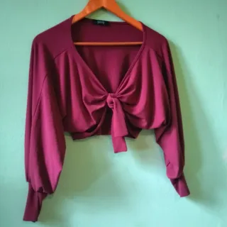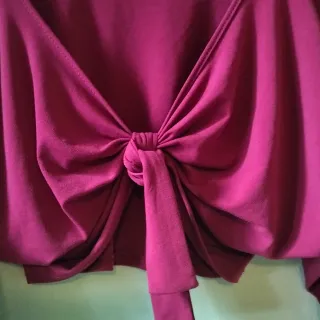 Elegante coprispalle rosso con nodo frontale. - Maniche lunghe a sbuffo. - Tessuto morbido e drappeggiato.