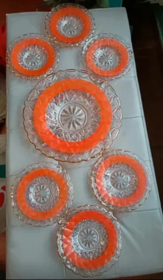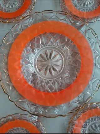 LAST PRICE Elegante servizio di 6 piatti più piatto grande da dessert in cristallo con finiture dorate. Perfetti per occasioni speciali. Diametro Piattini cm. 18 piatto grande cm 30 - Design con bordo ondulato, lavorazione del cristallo in rilievo nella parte che rimane sotto. - Dettagli dorati lungo il bordo. Alcune piccole imperfezioni nella fascia arancione come da foto
