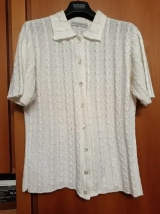 Cardigan corto in maglia color panna, con scollo a V e bottoni. Ampiezza spalle cm 40 Da ascella ad ascella cm 47,5 Lunghezza cm 59 - Maniche corte. - Texture a trecce. - Collo a camicia.