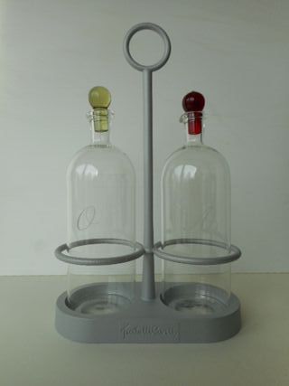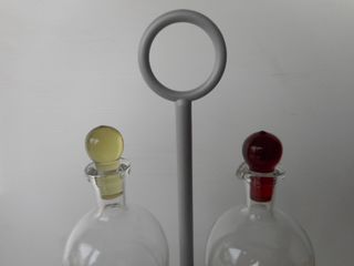 Elegante set per olio e aceto, perfetto per la tua tavola. - Design moderno con finiture in metallo argentato. - Bottiglie trasparenti per un facile controllo del contenuto. - Tappo rosso per l'olio e giallo per l'aceto.