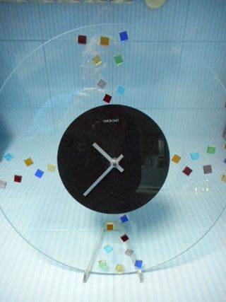 Elegante orologio da parete con struttura in vetro trasparente e quadrante nero. NB: Piccola scheggiatura che si nota pochissimo. Diametro 36cm. - Design moderno con tessere colorate. - Lancette bianche.
