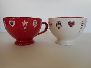 Set di due ciotole e zuccheriera Brandani con simpatici decori a tema. - Una ciotola è rossa con decori bianchi. - L'altra ciotola è bianca con decori rossi. - la zuccheriera e rossa con decori bianchi.