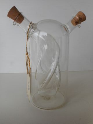 Elegante bottiglia in vetro soffiato, perfetta per Olio & Aceto. Elegante bottiglia in vetro trasparente con design artistico a doppia camera: perfetta per servire olio e aceto in modo raffinato. Materiale: vetro soffiato di alta qualità Design: camera interna intrecciata per separare i liquidi, con due beccucci e tappi in sughero Condizioni: nuova, mai utilizzata Ideale per: cucina, tavola apparecchiata, regalo originale Un pezzo funzionale e decorativo, perfetto per chi ama un tocco di stile anche nei piccoli dettagli. - Design unico con due beccucci. - Tappi in sughero inclusi. - Decorazione dorata con filo metallico.