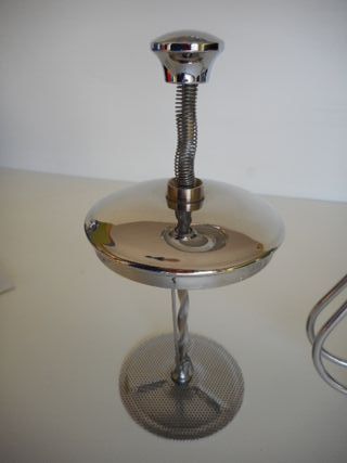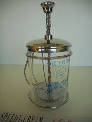 Sbattitore multiuso per la cucina, ideale per preparare creme e montare panna. - Design elegante con finiture in metallo lucido. - Contenitore trasparente in vetro. - Meccanismo a molla per un facile utilizzo.