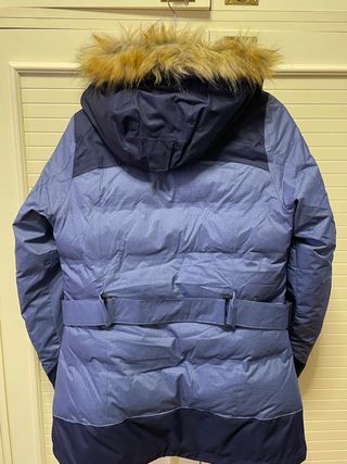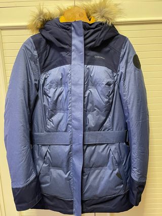 Giacca invernale da donna Quechua, perfetta per le giornate fredde. - Colore blu con dettagli in blu scuro. - Cappuccio con pelliccia sintetica. - Cintura in vita per un fit personalizzato. - Logo Quechua sul petto.