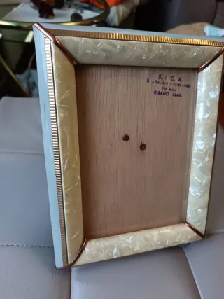 Elegante cornice portafoto vintage, perfetta per dare un tocco retrò alla tua casa. Realizzata con materiali di qualità per conservare i tuoi ricordi più preziosi. Produzione anni 50 ditta Italiana cornici AFA come da timbro sul legno. - Dimensioni interne: 24x18 cm. Foto 17x12 - Dettagli in metallo color oro. - Finitura in simil-madreperla.
