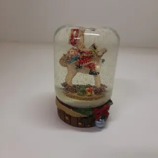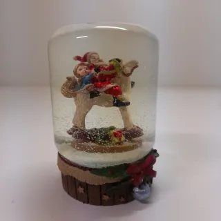 Deliziosa palla di vetro con decorazioni natalizie al suo interno. Perfetta per aggiungere un tocco magico alla tua casa durante le feste. - Scena interna con bambino e Babbo Natale su cavallo a dondolo. - Base decorata con festoni e fiocco rosso. - Fiocchi scintillanti all'interno del globo.