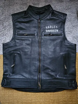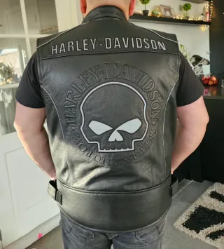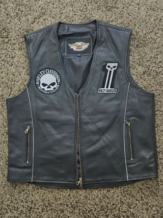 Gilet in pelle Harley-Davidson con un design iconico. - Logo Harley-Davidson con teschio sul retro. - Dettagli riflettenti. - Cuciture bianche a contrasto.