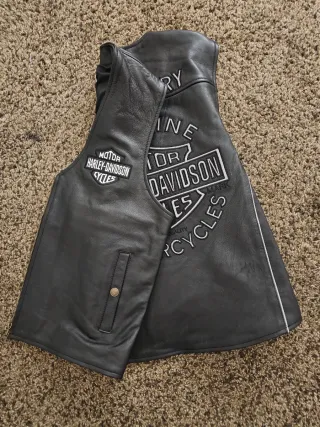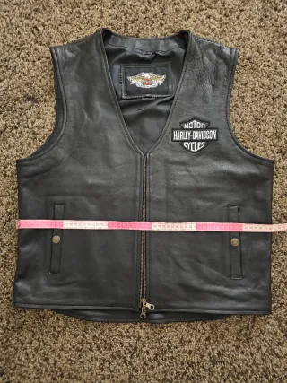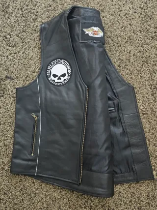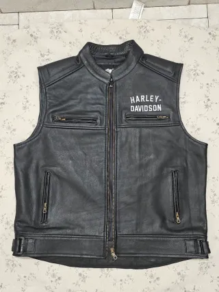 Chaleco de cuero con el icónico logo de Harley-Davidson Gilet In Vera Pelle Di Vitello altissima qualità Di Pelle Gilet e Nuovo Utilizzato due o tre volte però Ancora come nuovo senza graffiato condizioni perfetta - Diseño sin mangas. - Parche frontal con MOTOR y HARLEY-DAVIDSON CYCLES. - Cierre frontal con botones a presión. - Detalle acolchado en la parte inferior trasera.