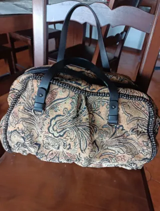 Elegante borsa in velluto con una ricca fantasia.Nuova senza cartellino. Trattasi di regalo non utilizzato. In velluto e strass. Colore giallo ocra e marrone. Lookat Accessori. Molto capiente. Rovinata la similpelle nella base della borsa come da foto per il resto è in perfette condizioni. OCCASIONE - Dettagli con piccole perline lungo i bordi. - Manici in pelle nera. - Fodera interna in tessuto.