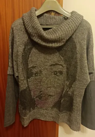 Maglione da donna con un design unico. Mohair e acrilico. - Collo alto a costine. - Stampa frontale di un volto. - Maniche lunghe.