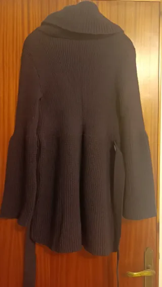 Elegante cappotto in maglia, perfetto per aggiungere un tocco di stile al tuo guardaroba. Colore viola. Svendo perché non mi sta più. - Ampio collo a scialle. - Chiusura con bottone. - Cintura in vita per una silhouette definita. - Maniche a campana. - Dettagli con bottoni sui fianchi.