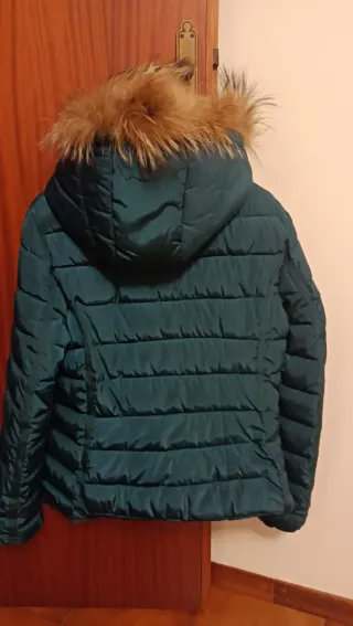 Caldo giubbotto con cappuccio bordato di pelliccia. Colore verde petrolio. Taglia L con vestibilità 42. Molto comoda e calda. Perfette condizioni. - Chiusura frontale con zip + bottoni. - Due comode tasche laterali con zip. - Imbottitura trapuntata. - Cappuccio staccabile con pelliccia.
