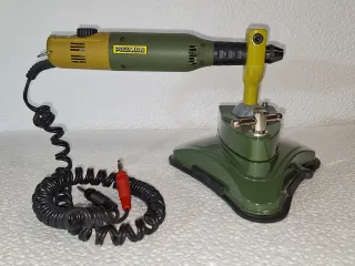 Fresa Proxxon completa di supporto. - Colore giallo e verde. - Cavo a spirale con connettori. - Supporto con morsetto e manopola.