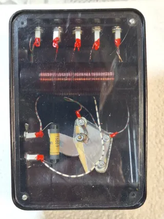 Radio galena vintage, un objeto de colección con un diseño clásico. Anni 1940/50 marca VAAM (Vannes Ambrosi Milano) materiale bachelite nera. Completa di rilevatore a baffo di gatto. - Carcasa negra. - Dial con numeración. - Componente transparente con bobina de cobre.