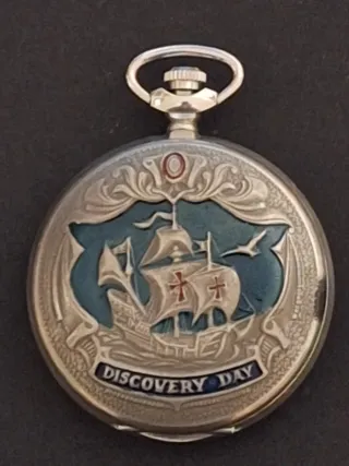 Elegante orologio da tasca con un'affascinante decorazione. Meccanismo robusto e funzionante. Omaggio a Cristoforo Colombo. Chiusura a conchiglia. - Motivo di una nave a vela. - Dettaglio Discovery Day sul bordo. - Cornice decorata con motivi floreali e ancore.