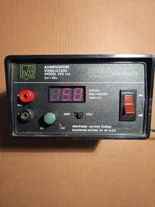 Alimentatore stabilizzato modello VPS 113. Misure cm. 15x15x8 - Tensione regolabile da 3V a 15V. - Corrente massima 5A a 12,5V. - Display digitale per tensione e corrente. - Limitatore di corrente elettronico.