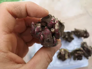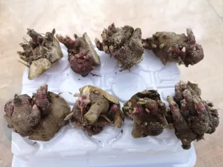 Pacchetto di rizomi di Yacon pronti per la semina. Questi rizomi sono la base per coltivare la pianta di Yacon, nota per le sue radici dolci e croccanti. - Rizomi di Yacon freschi. - Ideali per la coltivazione in vaso o in piena terra. - Germogli visibili sui rizomi.