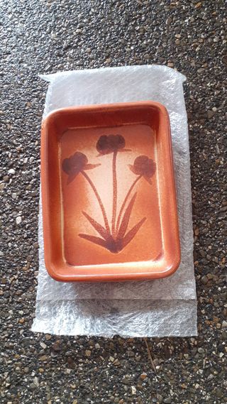 Pirofila in terracotta con un grazioso decoro floreale stilizzato. cm 32*24, nuova perfetto stato - Forma rettangolare. - Motivo a tre fiori con stelo e foglie. - Bordi arrotondati.