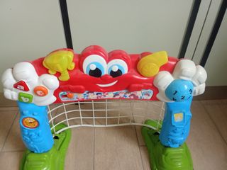 Porta calcio Chicco con simpatico leone. - Struttura in plastica colorata, ruote per spostarla - Rete rossa, pallina che si illumina, parla ed emette voci e canzoni, tutto in perfetto stato