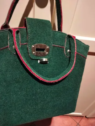 Borsa in lana cotta con dettagli in contrasto. - Materiale: lana cotta - Colore principale: verde - Dettagli: bordo e cuciture rosse - Chiusura: metallica a scatto