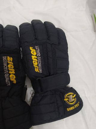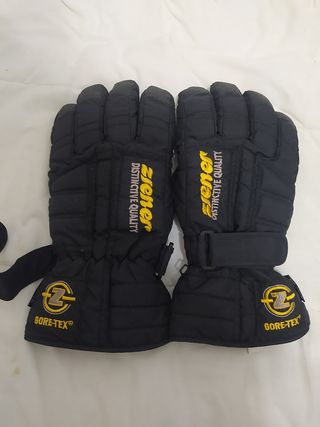 Guanti da sci neri Ziener con tecnologia Gore-Tex. Logo Ziener Z giallo sul polsino. Scritta GORE-TEX® sul polsino. Chiusura con velcro sul polso. Design imbottito. Come nuovi taglia 10