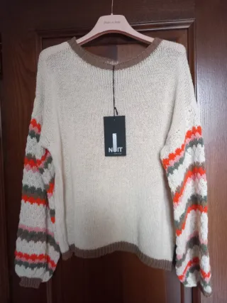 Maglia nuova con un design unico e vivace. - Maniche a zig-zag multicolore. - Collo e fondo a costine marroni. - Tessuto leggero e confortevole.