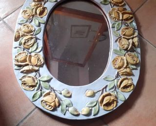 Bellissimo specchio artigianale con decorazioni in ceramica di Faenza. - Cornice ovale con rose gialle e foglie verdi. - Realizzato in ceramica e vetro. Vendo tutto in perfetto stato, senza difetti né imperfezioni, decorato a mano misure Cm 56 * 46, specchio artigianale in ceramica di Faenza firmato come in foto. Fiori e colori tutti intatti ed in perfetto stato, ceramica perfetta e vetro... Contattare Per maggiori informazioni ed accordi