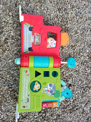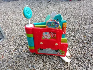 Libro interattivo Fisher Price a forma di macchinina, con elementi colorati e divertenti. - Colori vivaci: rosso, verde e azzurro. - Elementi decorativi come un semaforo e personaggi. - Scritta ABC 123 e In viaggio si impara! sul fronte. Emette varie canzoni e melodie con elementi interattivi ed elementi che si spostano e si muovono a mano eccetera 3 Maxi pagine cm 34, tutto funzionante