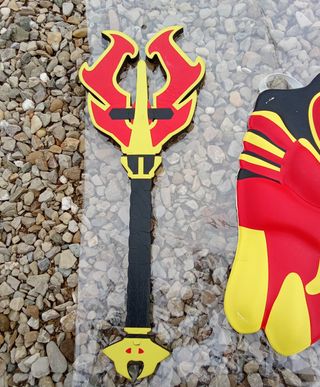 Set per travestimento composto da un tridente e un mantello. - Tridente con manico nero, impugnatura gialla e punta rossa con dettagli gialli. - Mantello rosso con inserti neri e gialli, con spalline bianche.