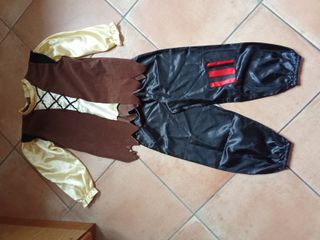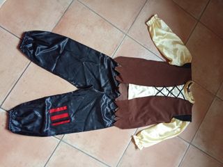 Costume da pirata per bambini, ideale per il Carnevale o feste a tema. Taglia come cartellino 3/4 anni - Completo composto da casacca e pantaloni. - Casacca con maniche color oro e dettagli marroni. - Pantaloni neri con dettagli rossi sulle gambe.