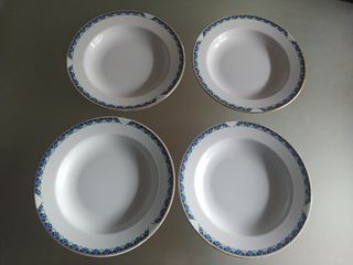 Set di quattro piatti fondi vintage collezione in porcellana Blu DECOR di FINI con un elegante bordo decorato. Design con motivo geometrico blu e verde. Bordo dorato sottile.
