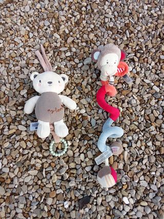 Set di due simpatici giochi per passeggino o culla... ottime condizioni, colori unisex, uno a forma di orsetto e uno di scimmietta. - Orsetto carillon con melodia da appendere - scimmietta con anello da appendere anche al maniglione del passeggino ovetto... parti in tessuto colorato.