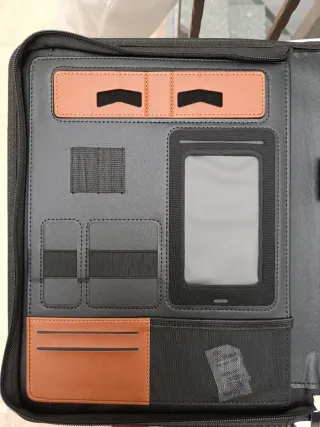 Elegante portadocumenti con finiture in pelle. - Materiale esterno nero. - Dettaglio a striscia marrone. - Placca rettangolare argentata sul davanti (ancora con cellophane). Bloc notes all interno.