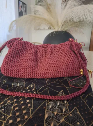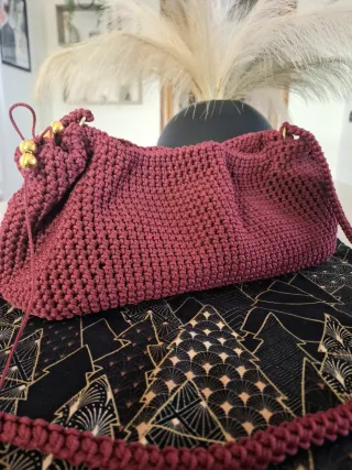 Borsa artigianale realizzata all'uncinetto, con un elegante design. - Colore bordeaux . - Dettagli con perle dorate. - Chiusura con cordoncino.