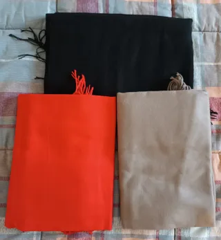 Set di tre sciarpe in diversi colori. Vendibili anche singolarmente al prezzo di 10,00 CAD. - Una sciarpa nera. - Una sciarpa rossa - Una sciarpa grigia.