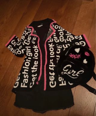 Set composto da cardigan, t-shirt, gonna e zainetto per bambina. - Cardigan nero con scritte bianche e dettagli rosa. - T-shirt nera. - Gonna nera con bordo sfrangiato. - Zainetto nero con applicazioni e scritta Girl.