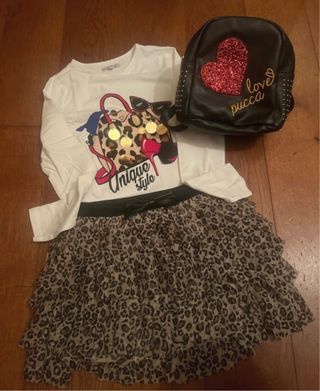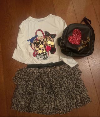 Set composto da gonna con stampa maculata, t-shirt bianca a maniche lunghe e zainetto nero. - Gonna con balze e fiocco. - T-shirt con stampa di borsa, scarpe e occhiali. - Zainetto con cuore glitterato e scritta love pucca.
