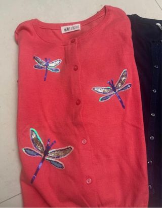 Cardigan per bambina 6/8 anni..uno rosa corallo con libellule con paiettes,l altro blu con rouge laterale con filo in lurex..Pari al nuovo