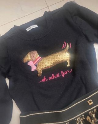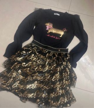 Set composto da maglione nero a maniche lunghe e gonna a balze per bambina. - Maglione con applicazione di un bassotto dorato con fiocco rosa e scritta oh what fun. - Gonna nera in tulle con stampa love dorata. - Elastico in vita.